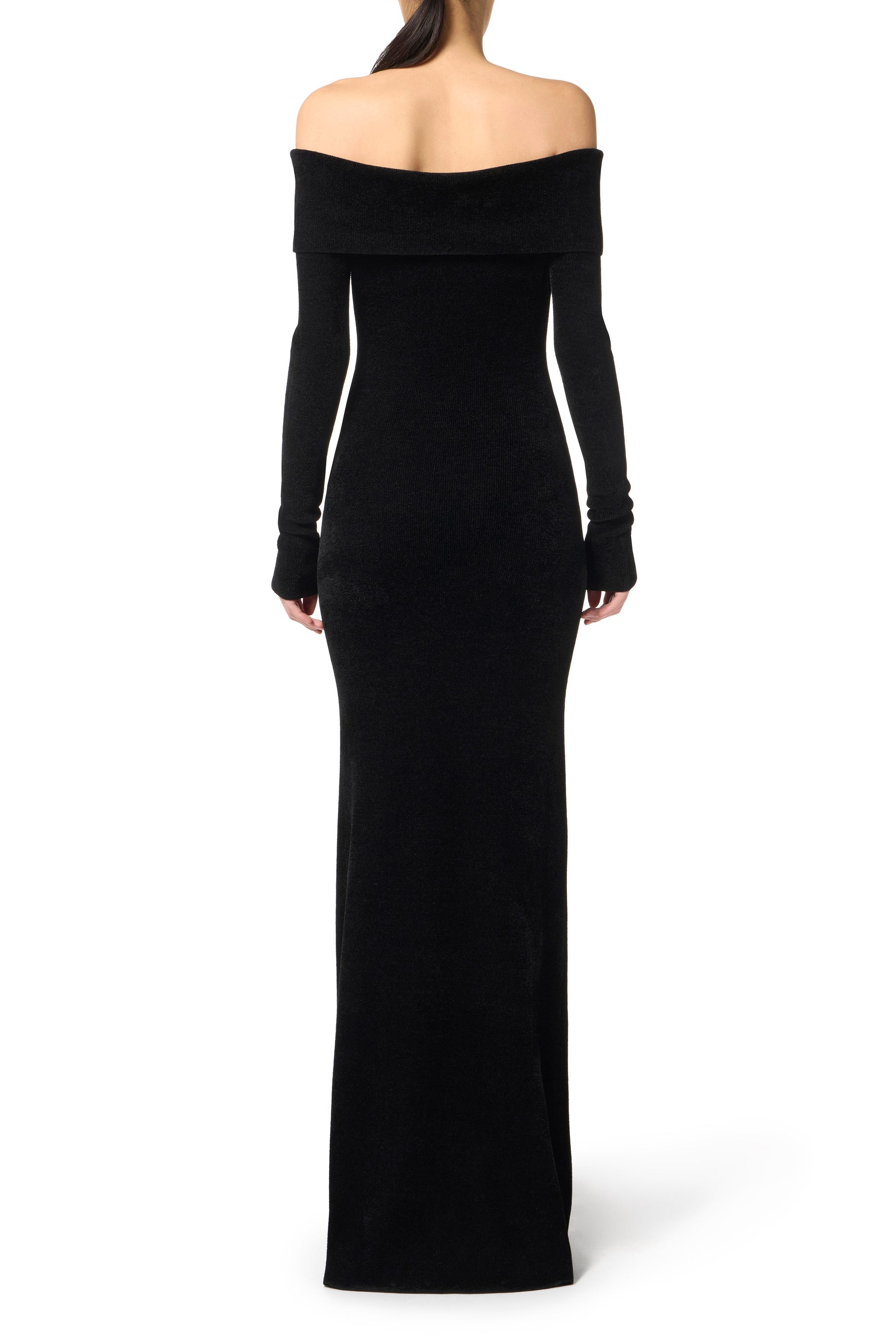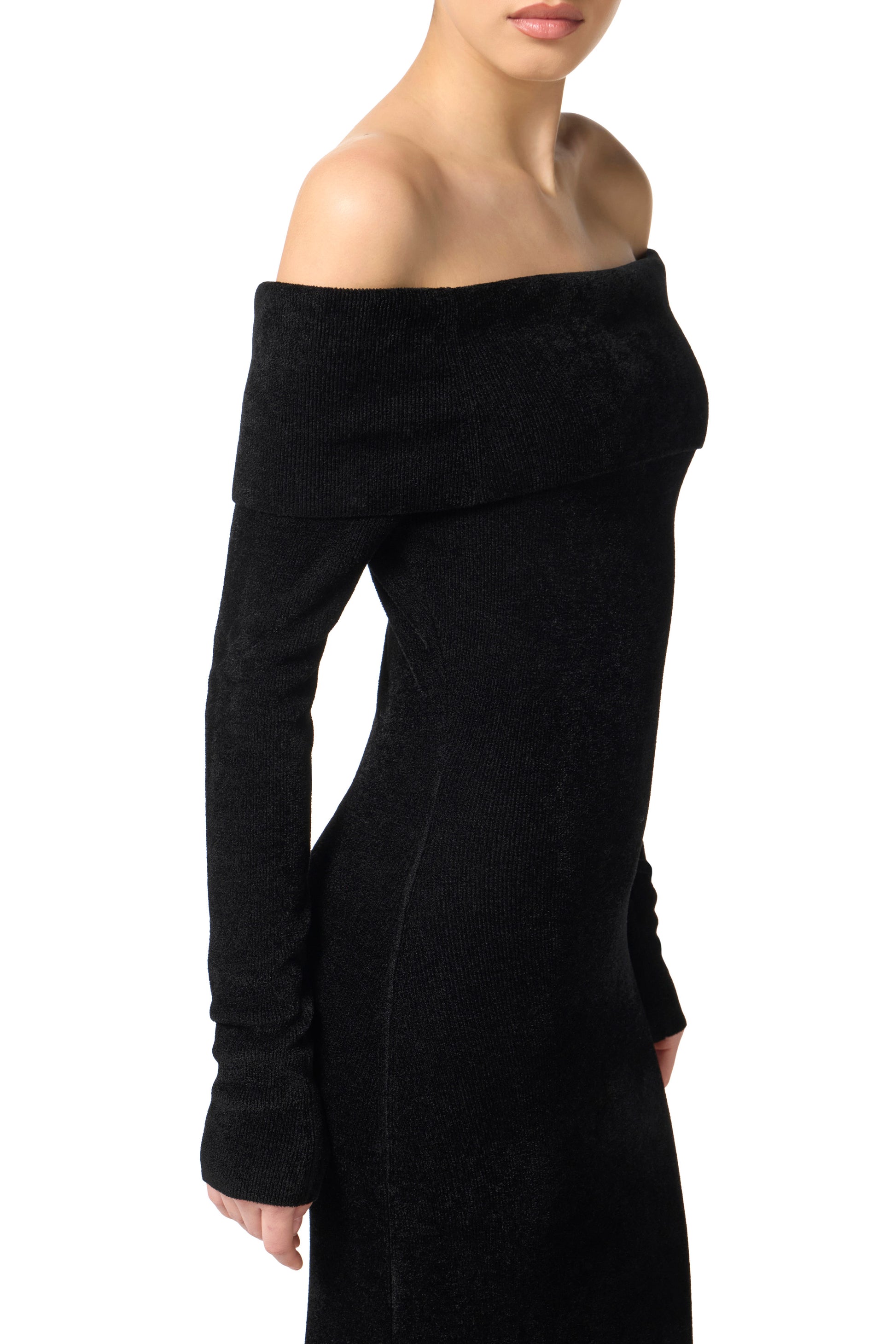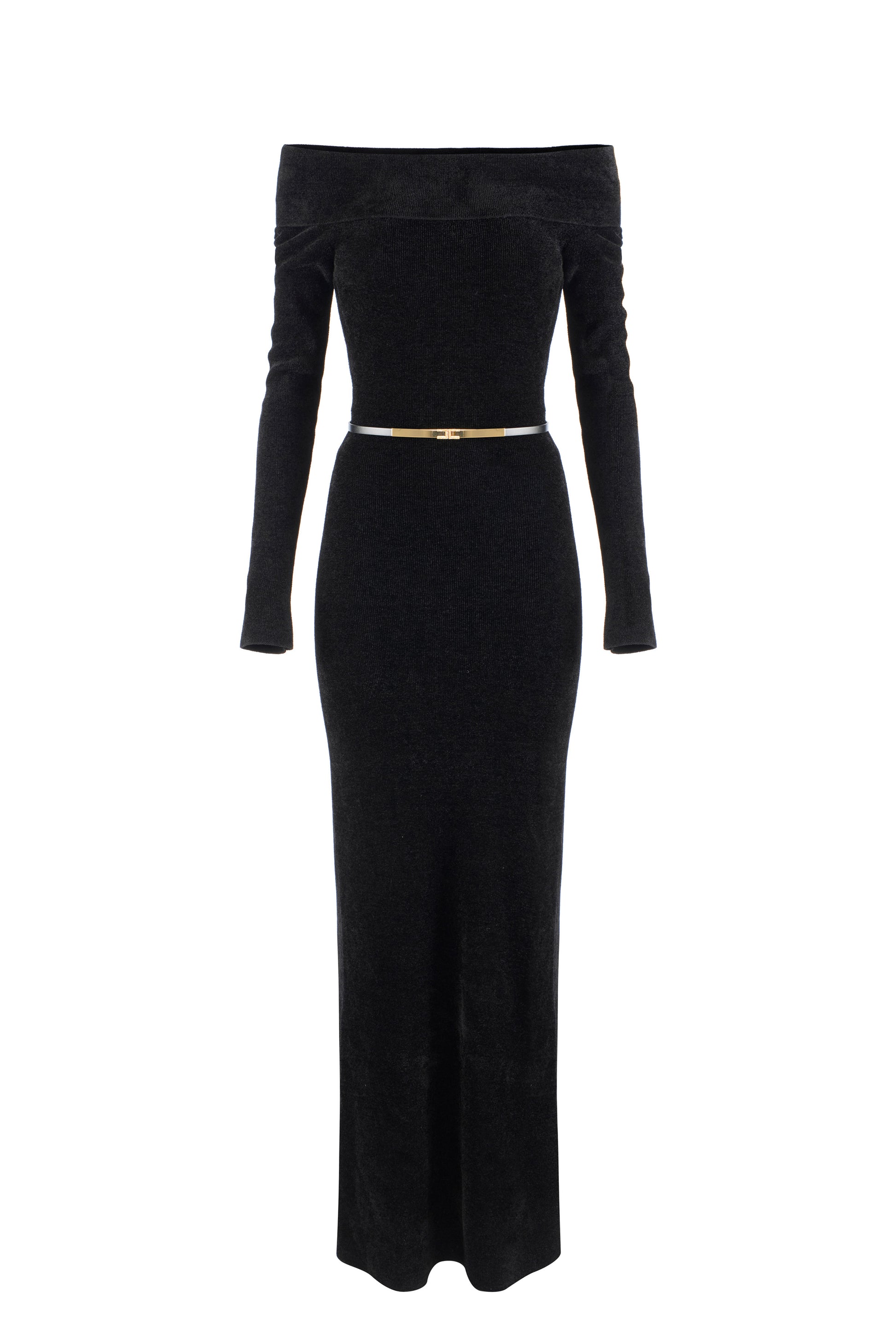Chenille evening dress with slim fit. The long-sleeved dress features a wide boat neckline, folded to wrap the shoulders and give a harmonious silhouette. The tubular belt has a golden metal detail and is removable, for many styling options.