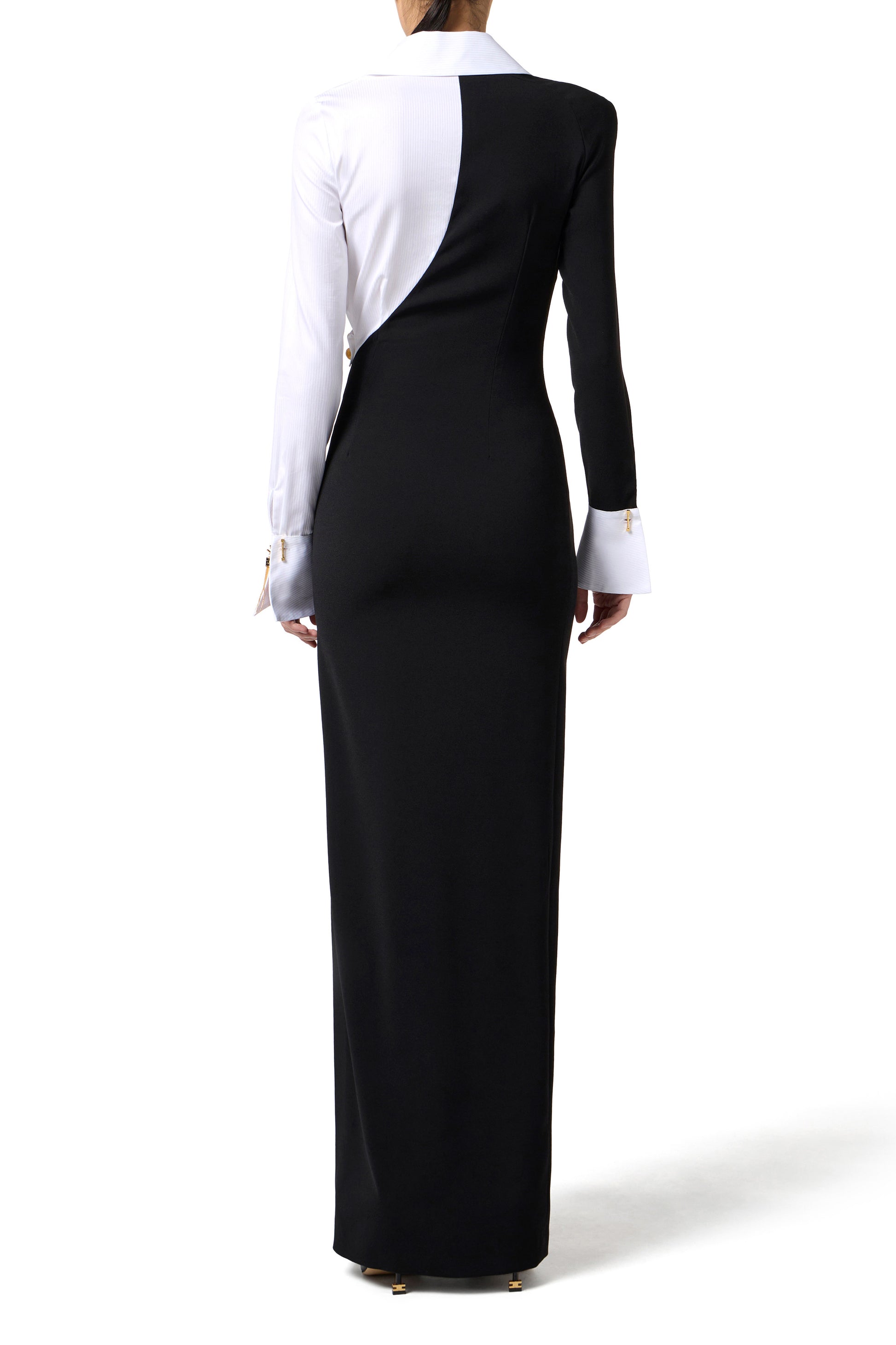 Evening dress in lightweight crêpe fabric with slim fit. The dress has structured shoulders and is characterised by a shirt collar and sleeve in cotton poplin, creating a clever contrast. The cuffs are embellished with logo cufflinks and a snake patterned tassel. Skirt with side slit for an additional bold touch.