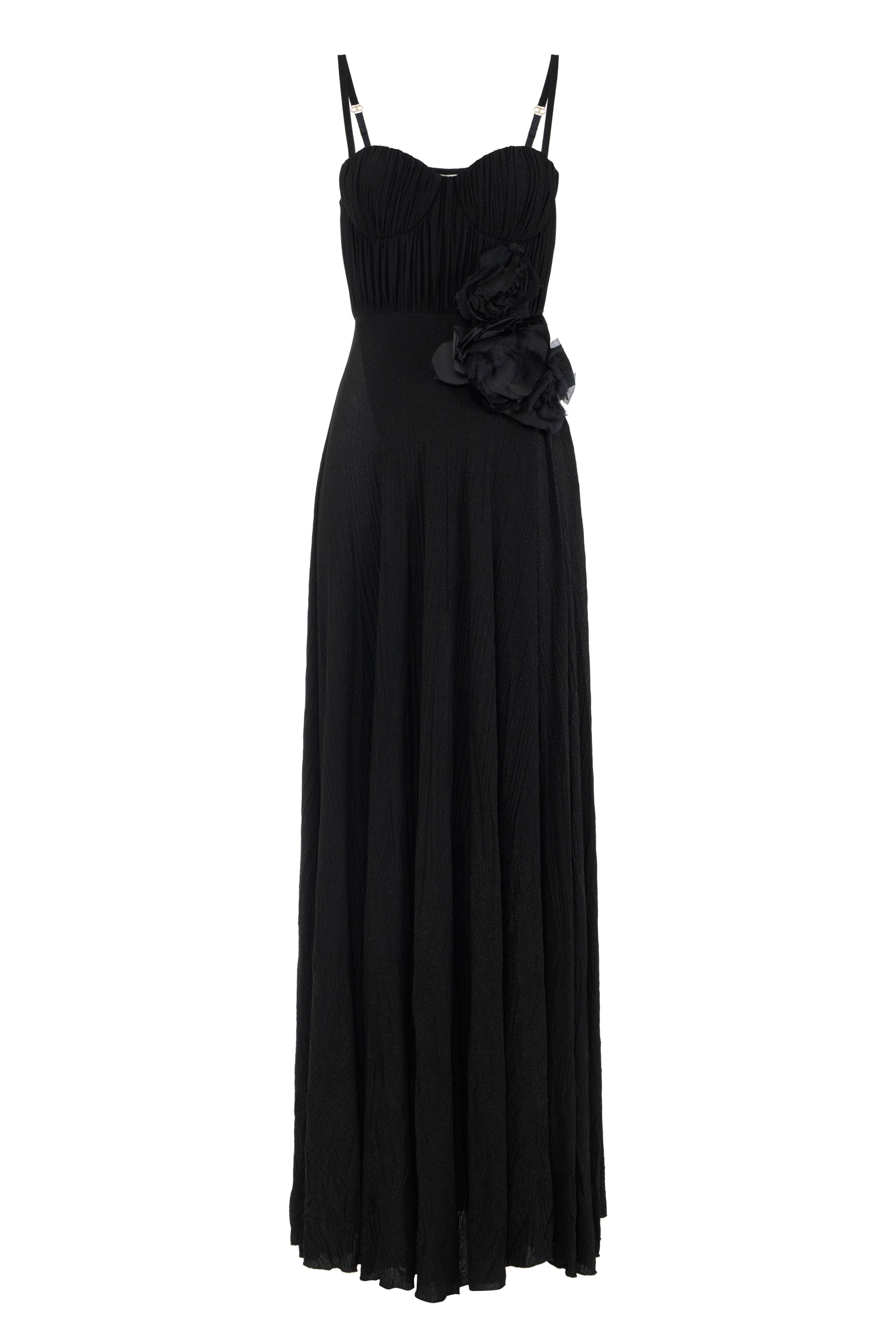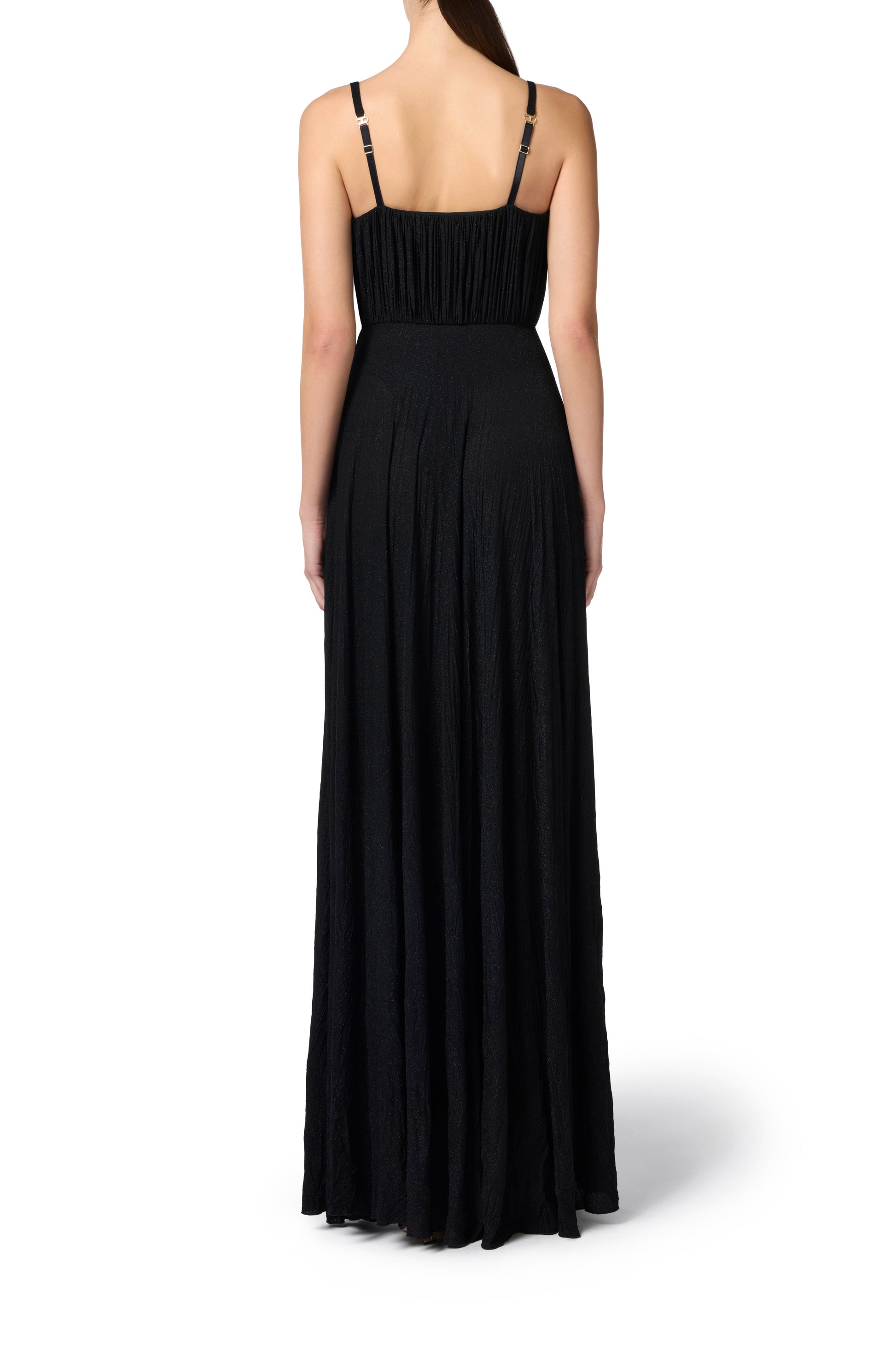 Evening dress in lurex jersey. The dress has thin straps with cups on the bust and stands out for the elegant floral application embroidered on one side. The skirt has a side slit and is enlivened by the particular crumpled texture at the bottom with a foliage effect. Slim fit.