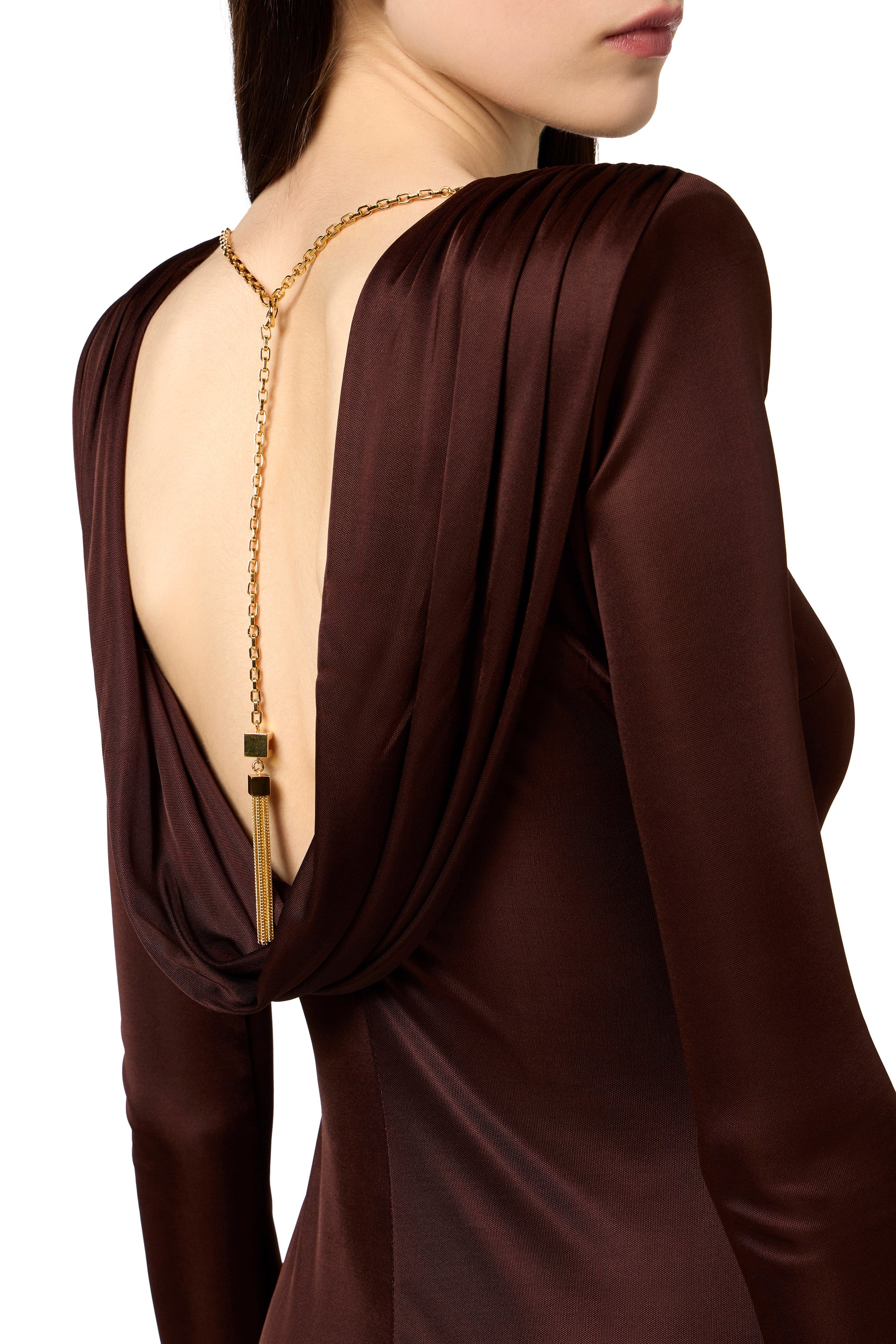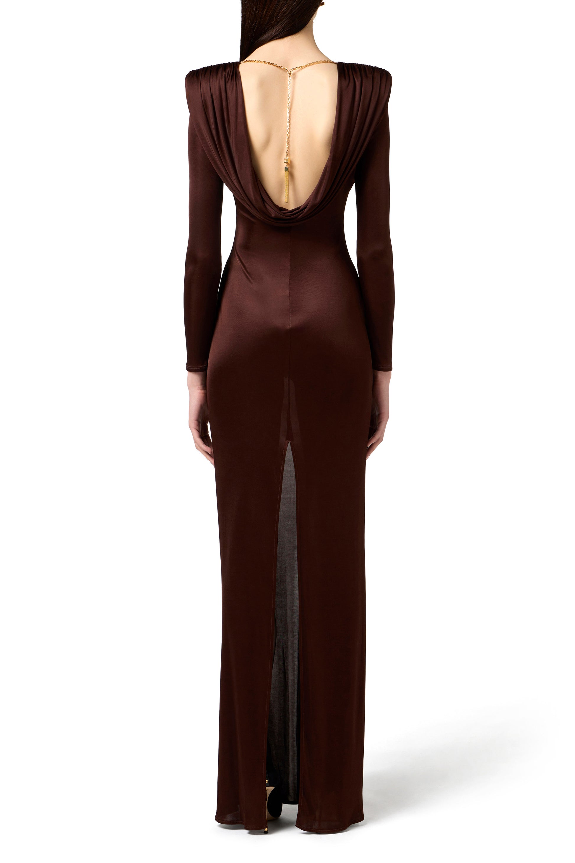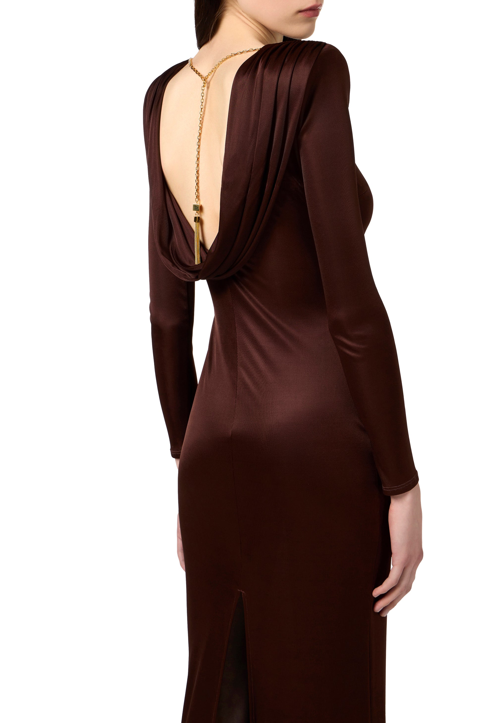 Evening dress in shiny viscose jersey fabric with slim fit. The dress features a boat neckline with structured shoulders, a refined back draping revealing a bare back and is enhanced by the chain jewel detail with snake textured tassel. Back slit for a daring touch.