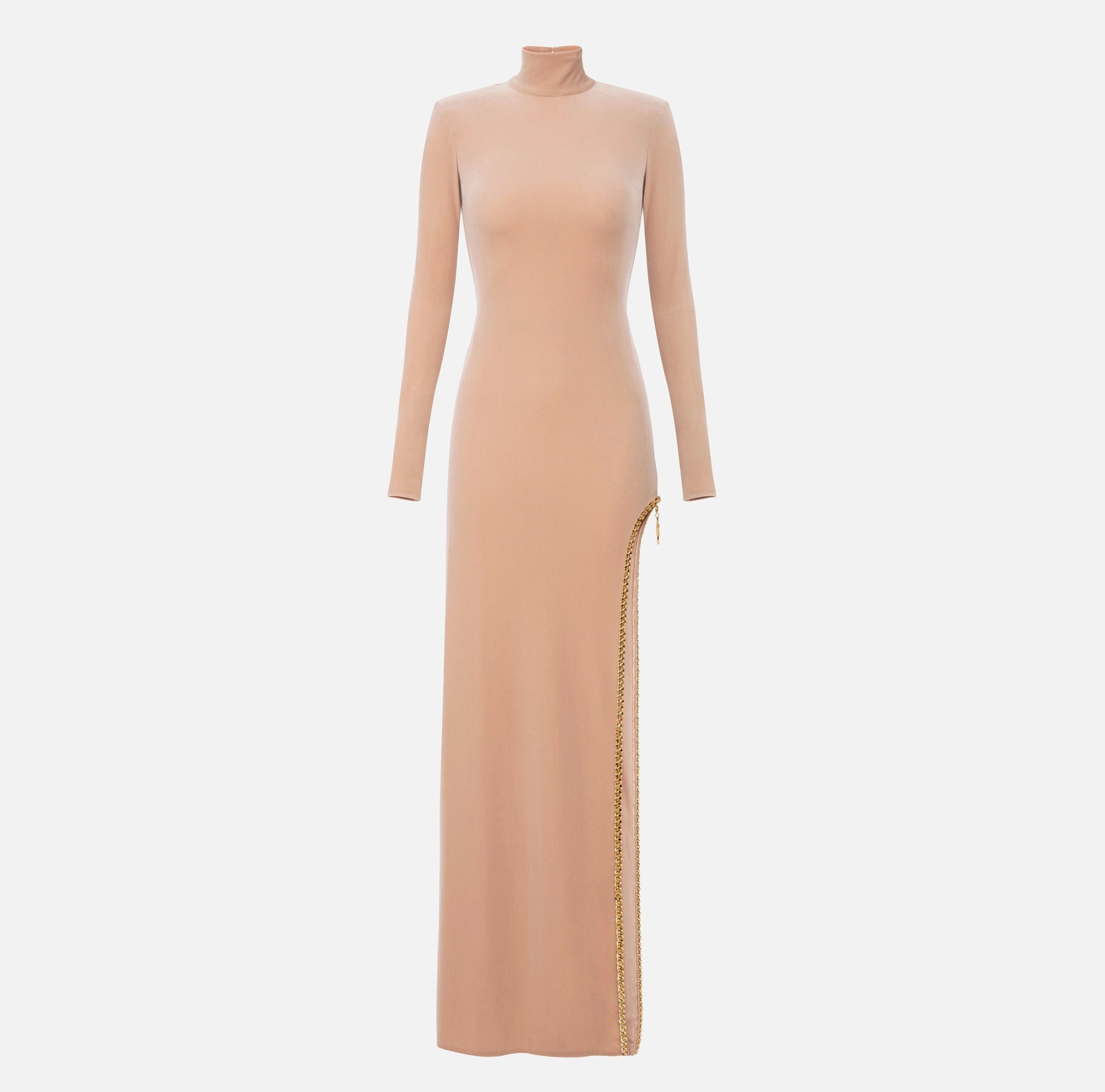 Red Carpet dress in stretch velvet with high collar and long glove sleeves. It features a wide side slit embellished with a maxi golden metal chain and logo charm