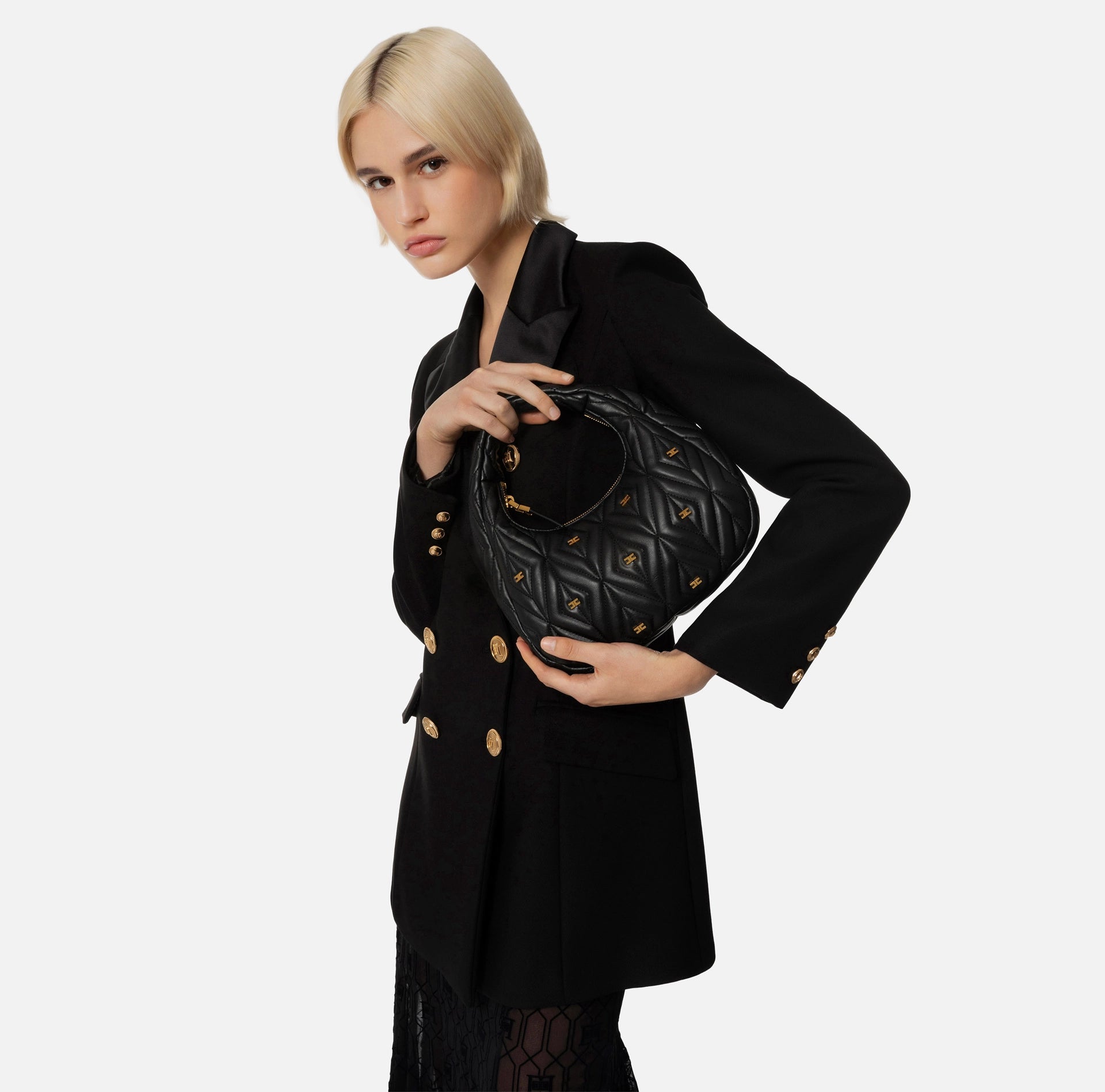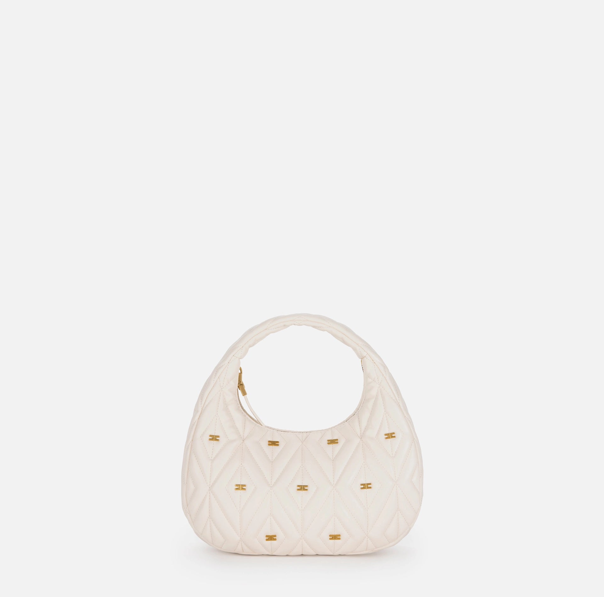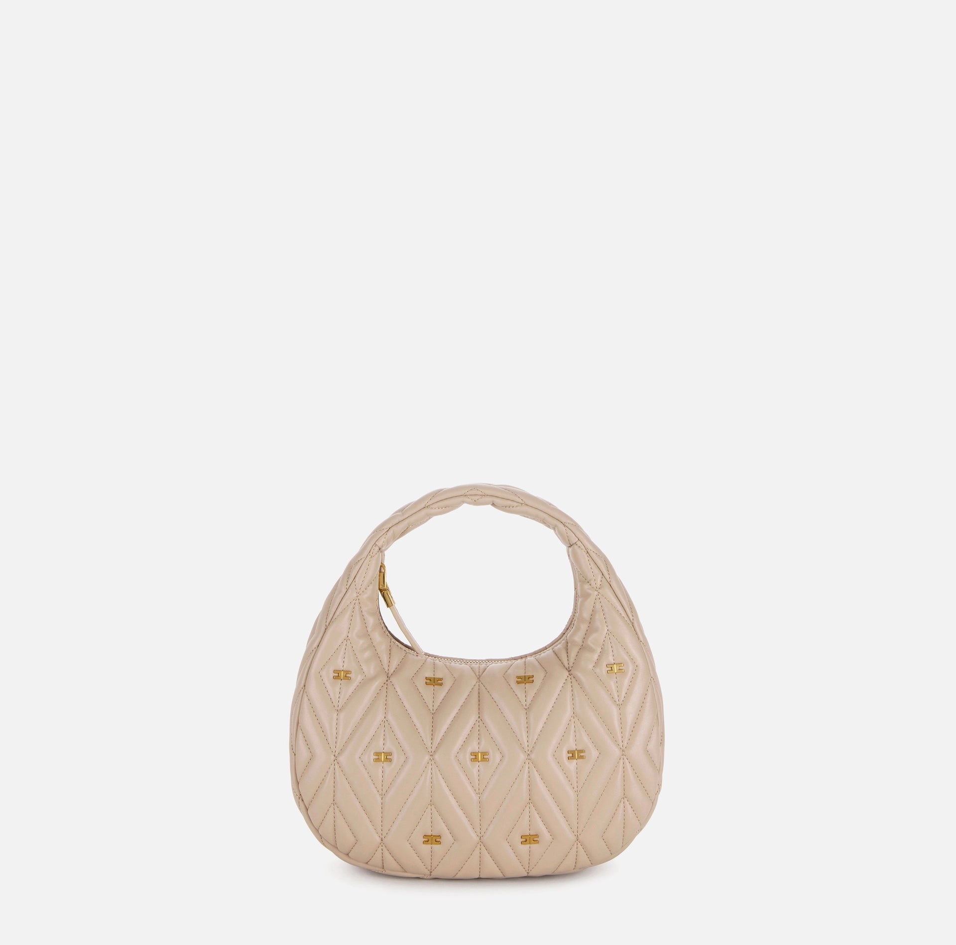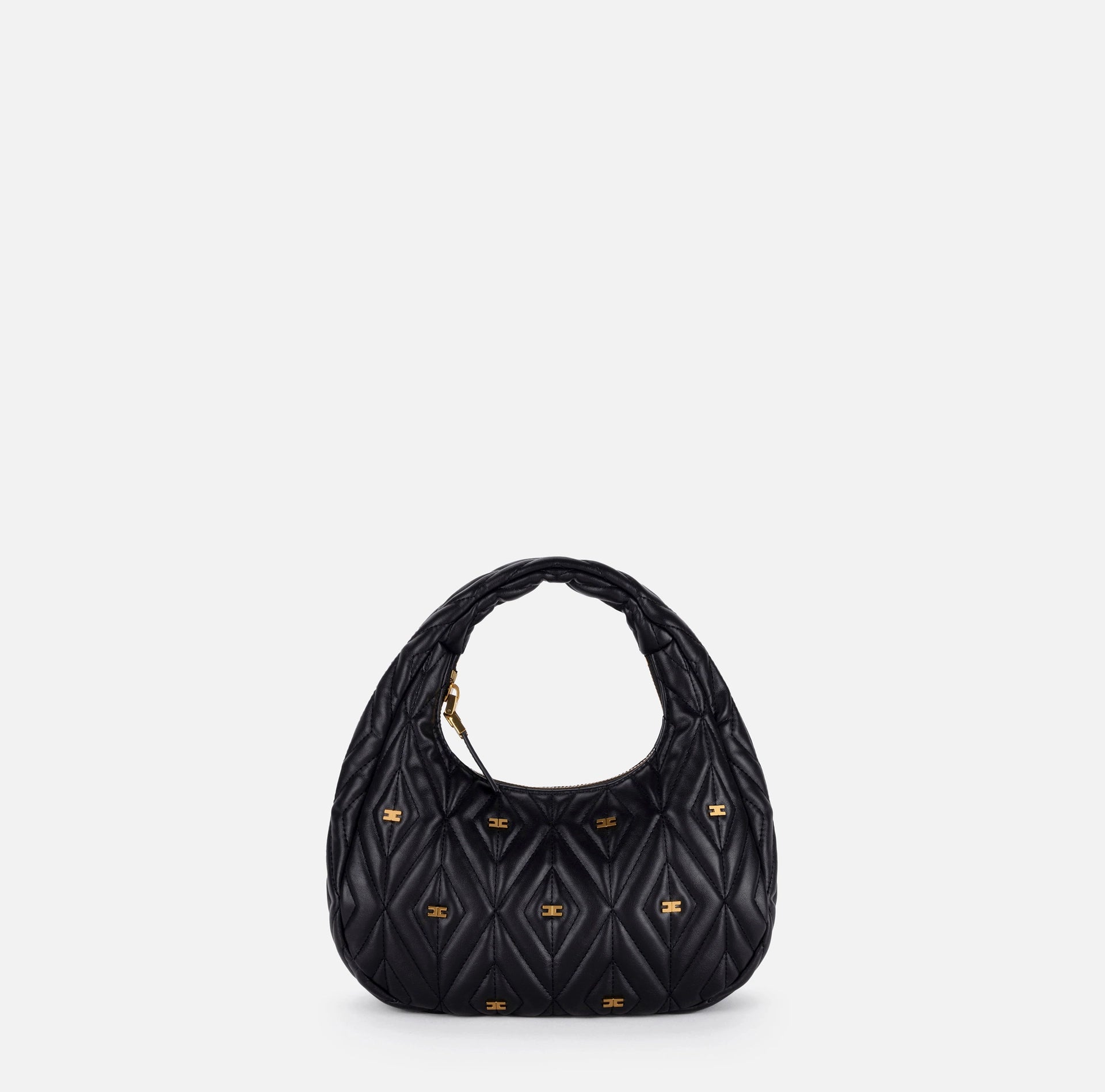 Small hobo bag in leather-effect synthetic material. Quilted and padded surface with a vintage golden logoed rivet in the centre.