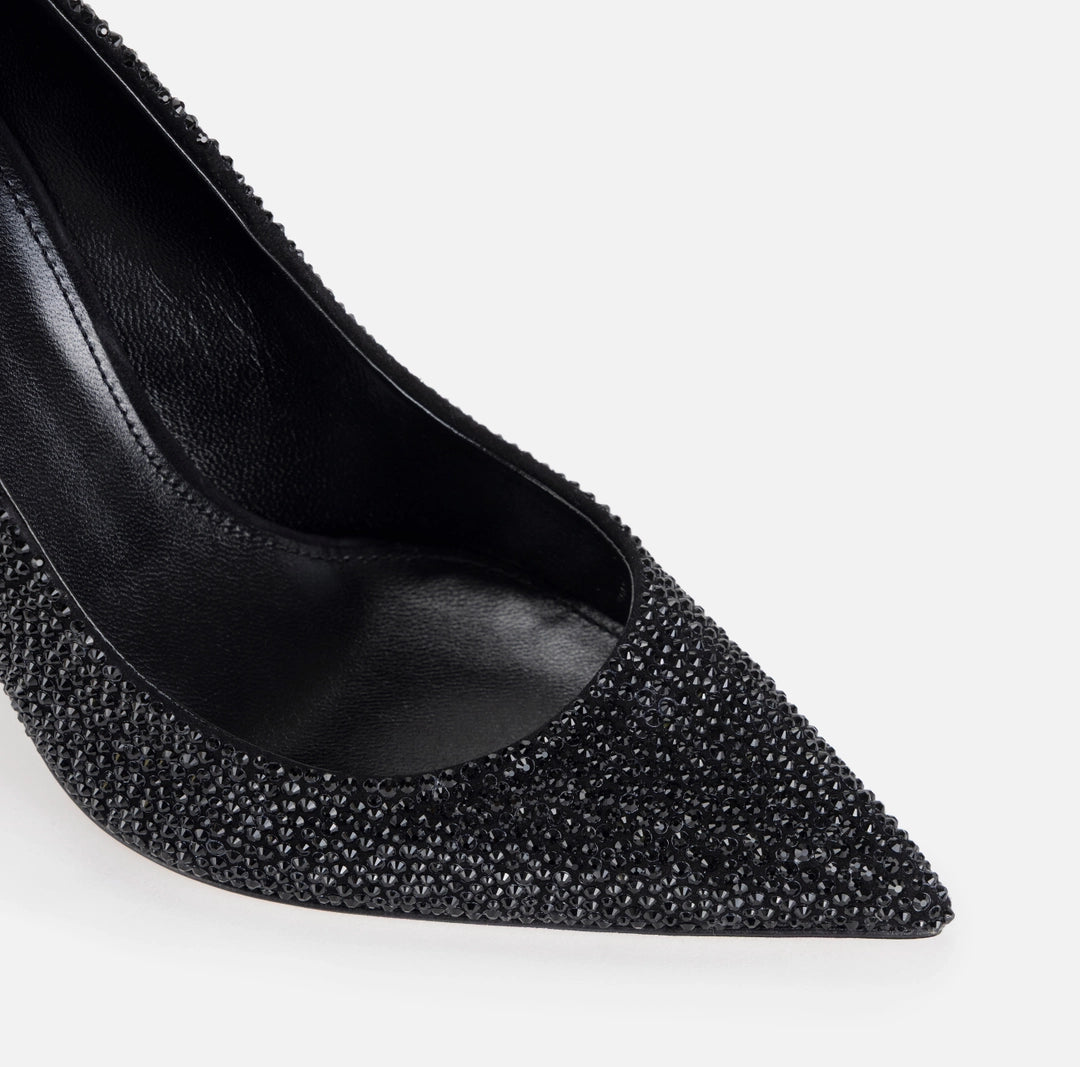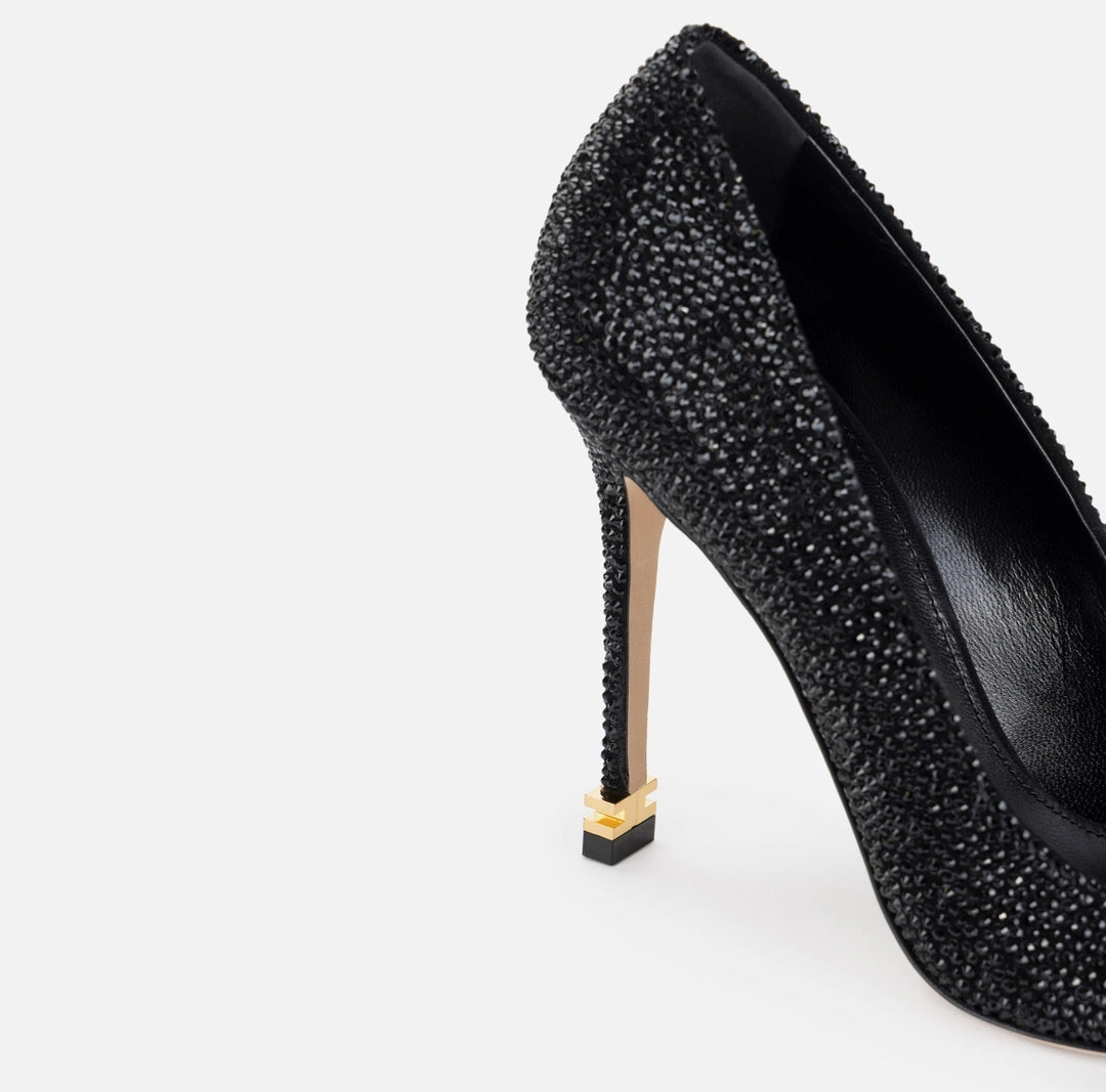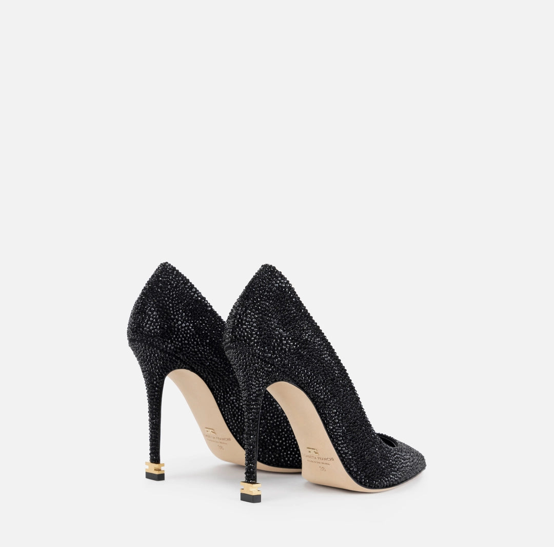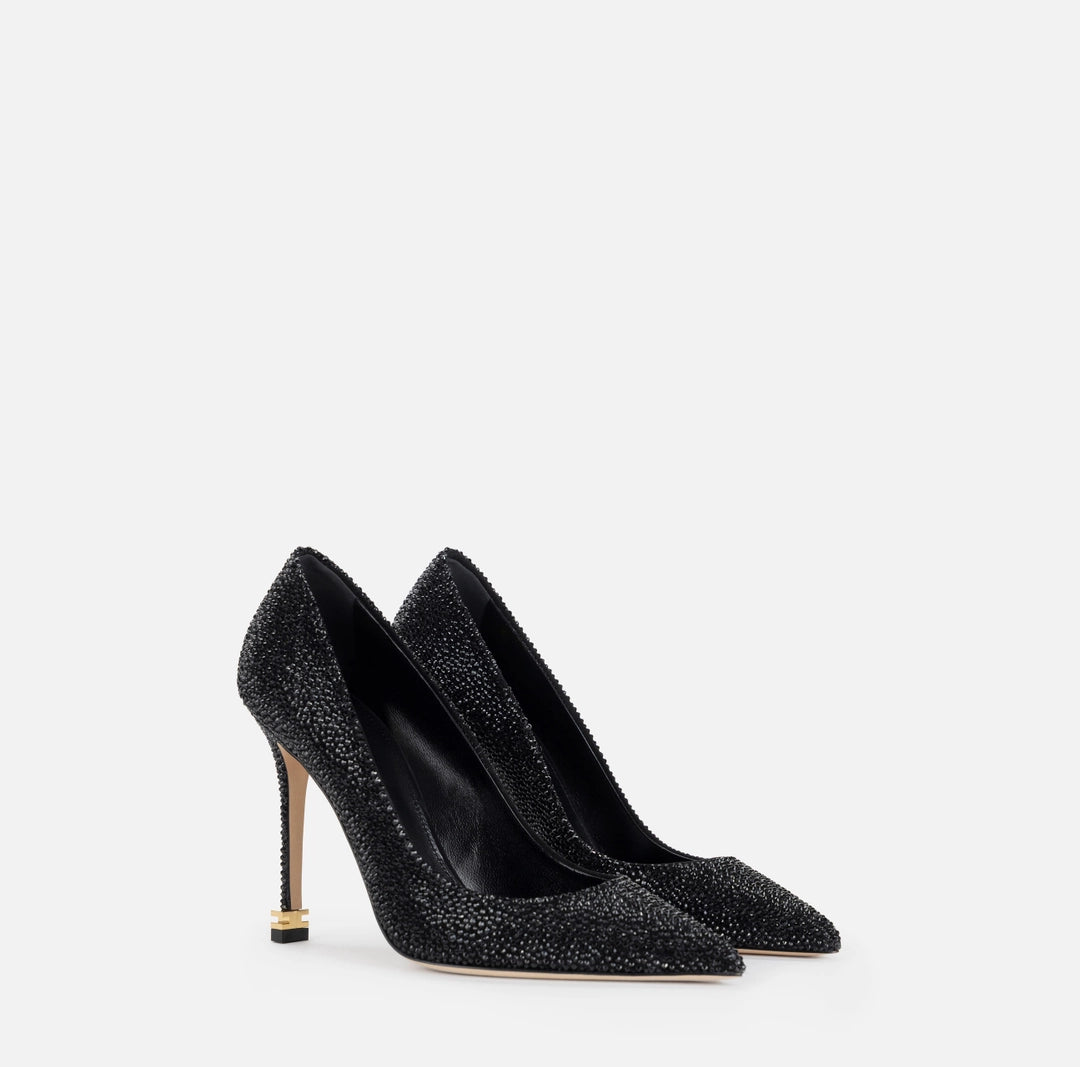 Décolleté with rhinestones on stiletto heel. Features gold metal logo on the base of the heel