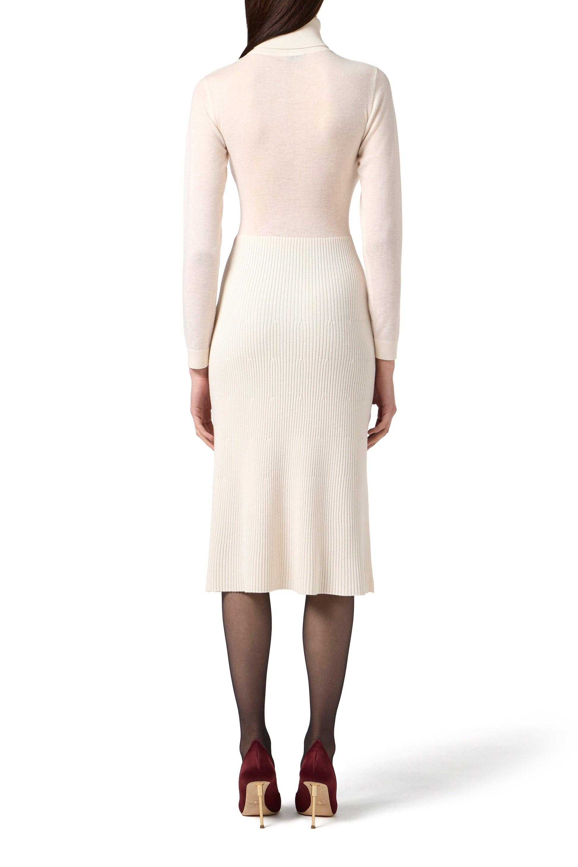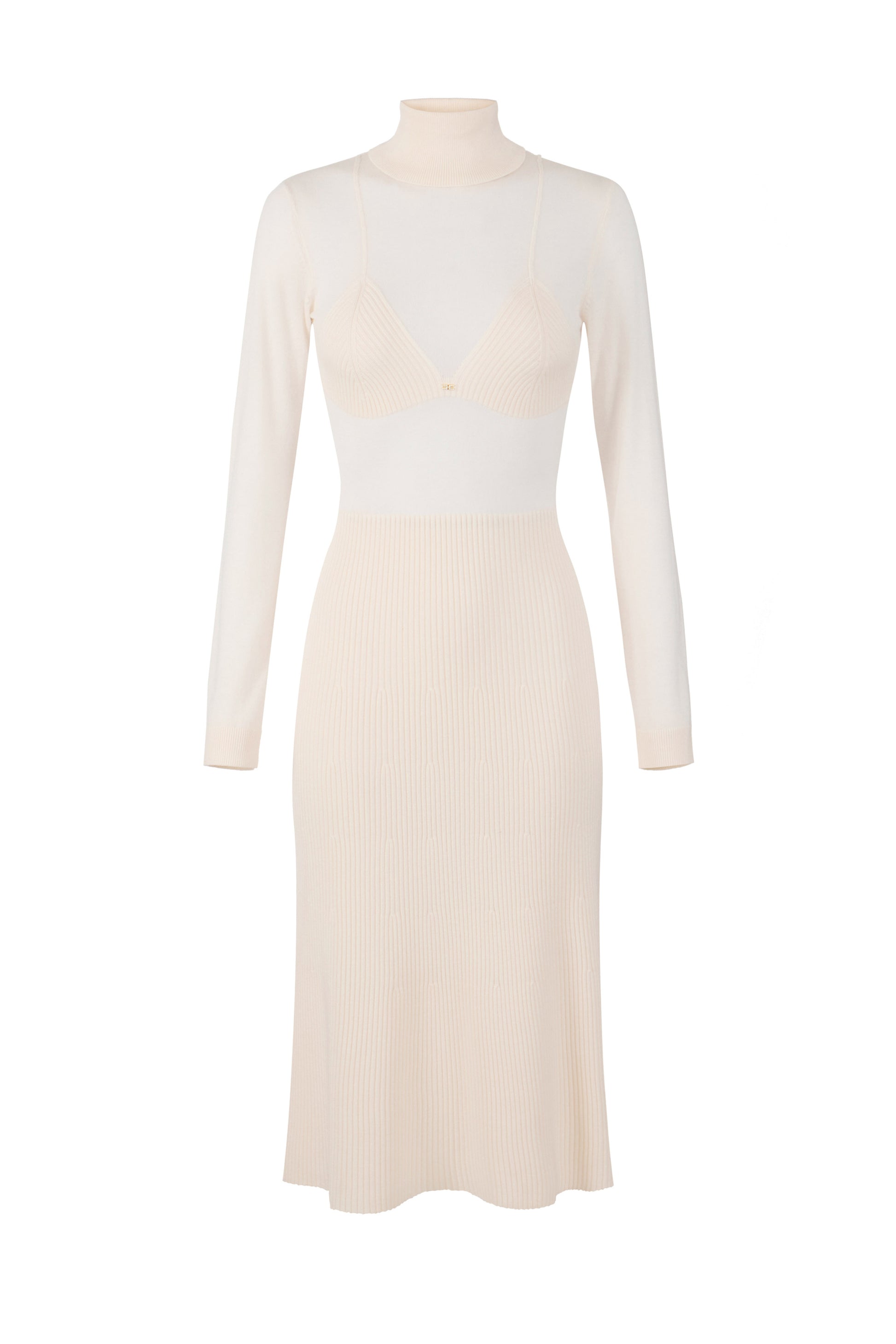 Wool blend dress with slim fit. The turtleneck dress features long sleeves and a line slightly flared at the bottom. It is characterised by ribbed workmanship in the bra and skirt, creating refined texture contrasts. Jewel detail with golden metal logo and rhinestones.